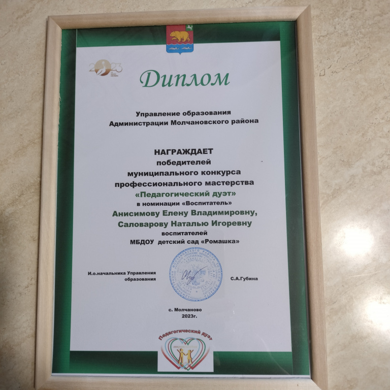 Наши воспитатели Анисимова Елена Владимировна и Саловарова Наталья Игоревна победили в муниципальном конкурсе педагогического мастерства «Педагогический дуэт», проходившего в рамках мероприятий Года педагога и наставника. 28 апреля на базе МАОУ «Молчановская СОШ №2» состоялся очный этап Конкурса, где педагогические дуэты из 7 образовательных учреждений Молчановского района представляли свои мастер-классы «Рецепт профессионального успеха» и прошли блиц-испытание «Воспитательный кейс».