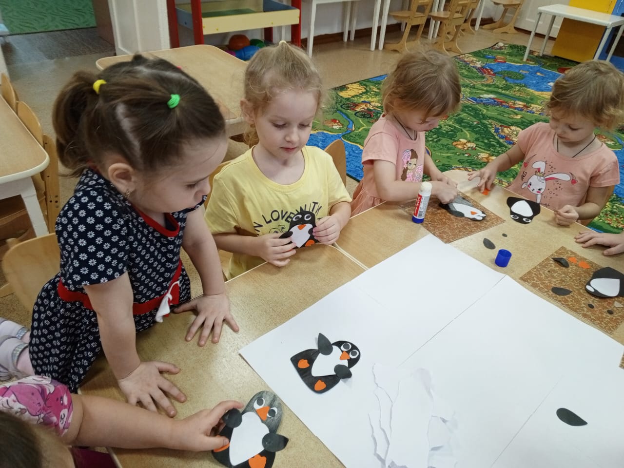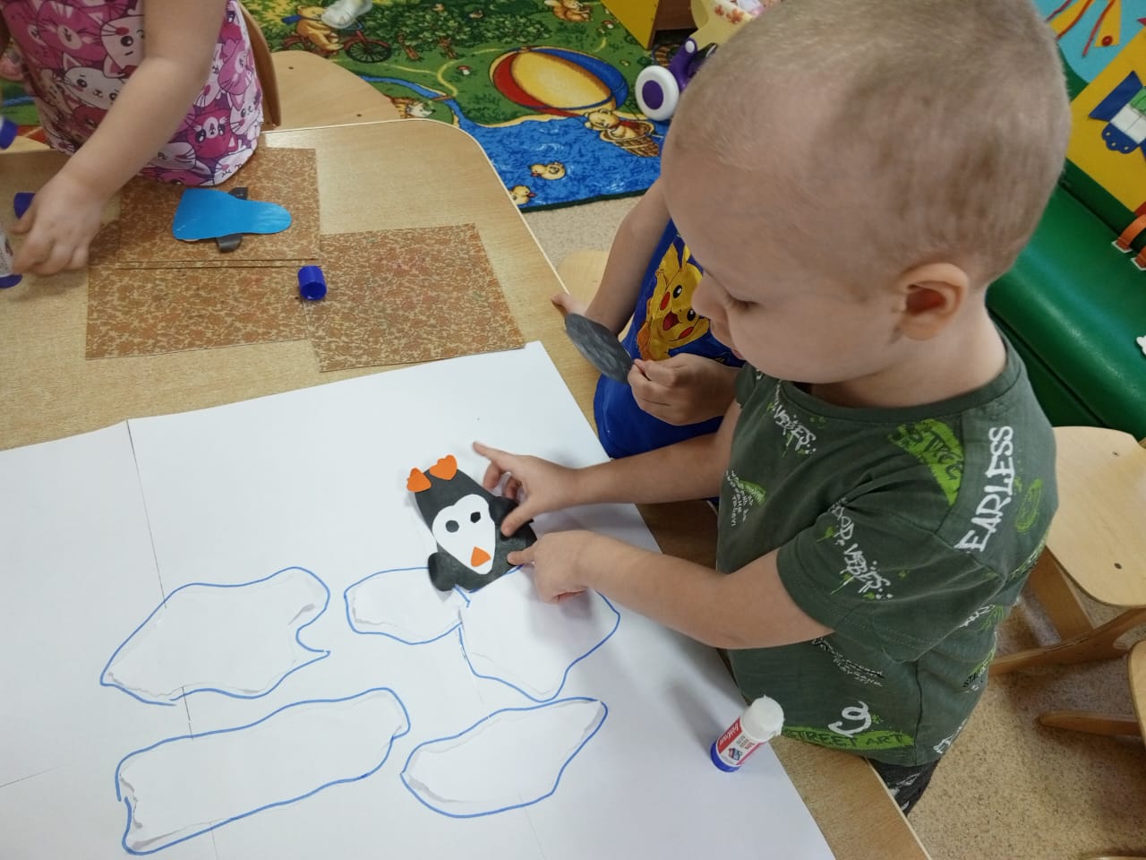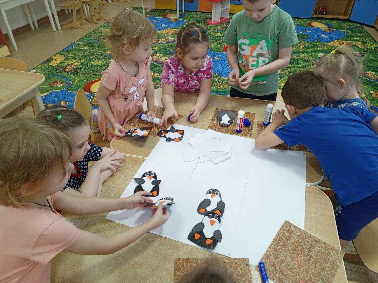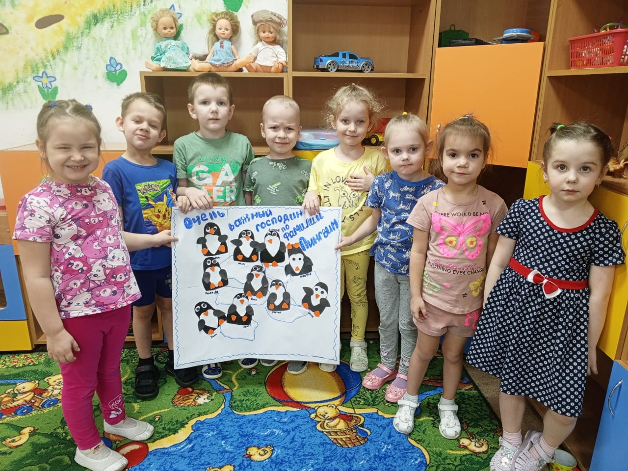 С удовольствием играли в игру «Бег пингвинов», отгадывали загадки, рисовали, а ещё узнали интересные факты о пингвинах – удивительных морских птицах:  пингвины находят своих партнеров по голосу, они издают специальные звуки, которые позволяют пингвинам определить друг друга в толпе. Тело у пингвинов такое, что отлично подходит для плавания в очень холодной воде и под водой. Голова и ноги маленькие. Передвигаются пингвины по суше пешком, переваливаясь на своих коротеньких ножках.