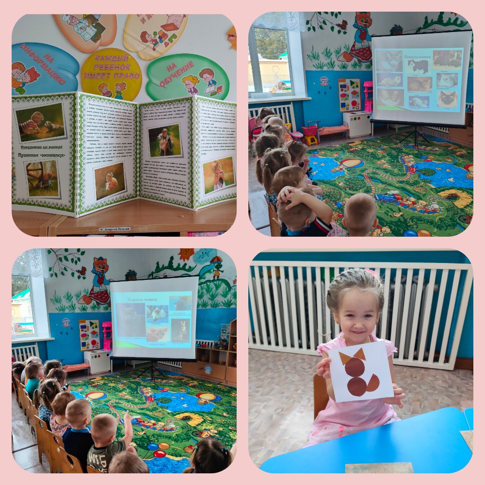 В старшей группе сделали фотовыставку, посмотрели презентацию «Такие разные кошки» и заучили потешку «Кошкин дом».