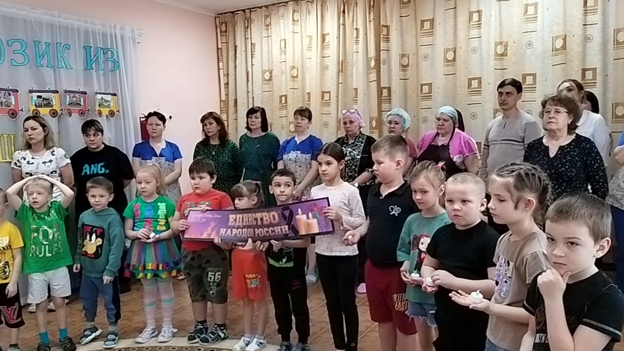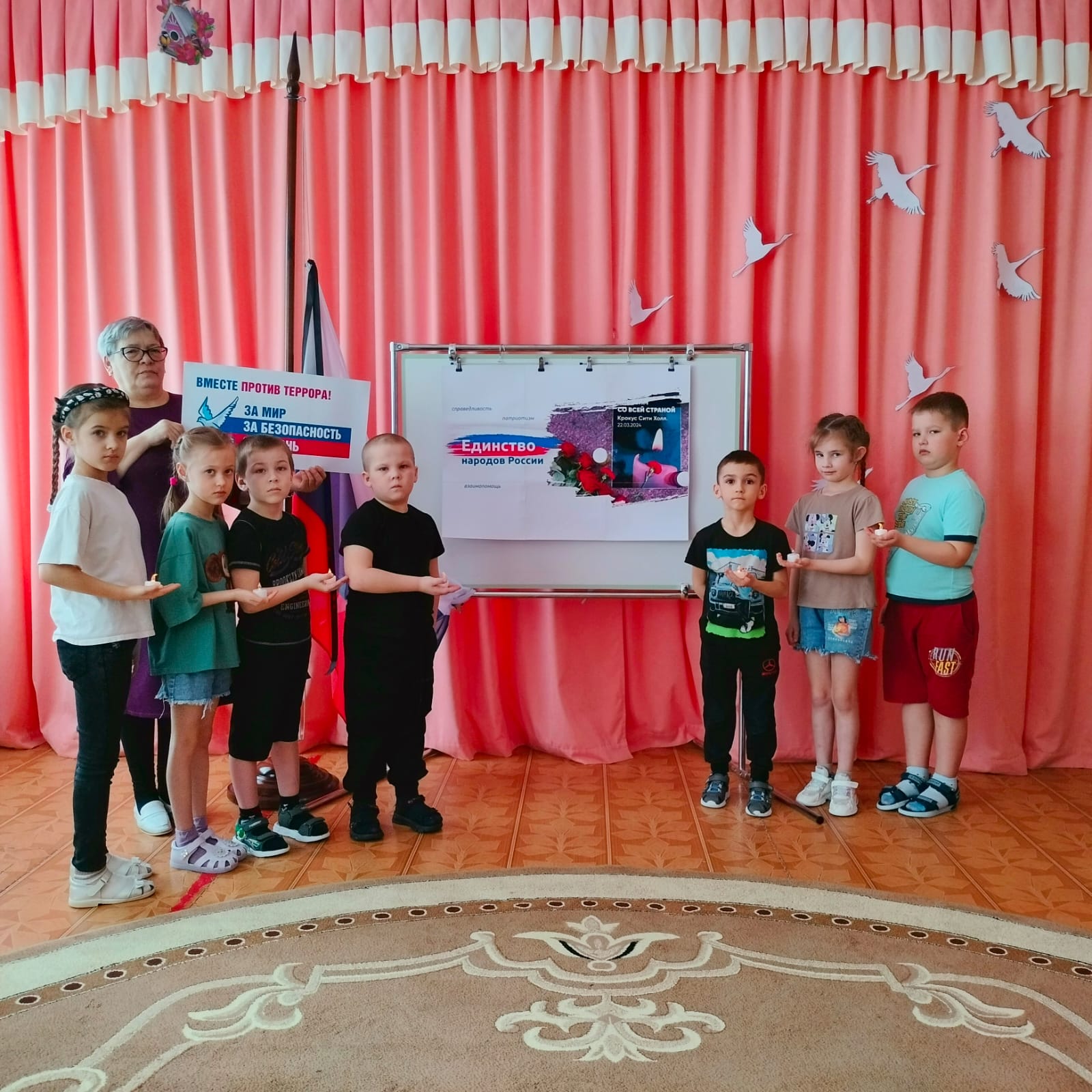 Рабочий день  начался с разговора о важном с воспитанниками старших групп и сотрудниками детского сада на тему «Единство народов России». Речь шла о справедливости, патриотизме, взаимопомощи россиян.  Наши дети не остались в стороне, почтили минутой молчания под отблески свечей тех, кто погиб в концертном комплексе 22 марта 2024 года в подмосковном Красногорске.