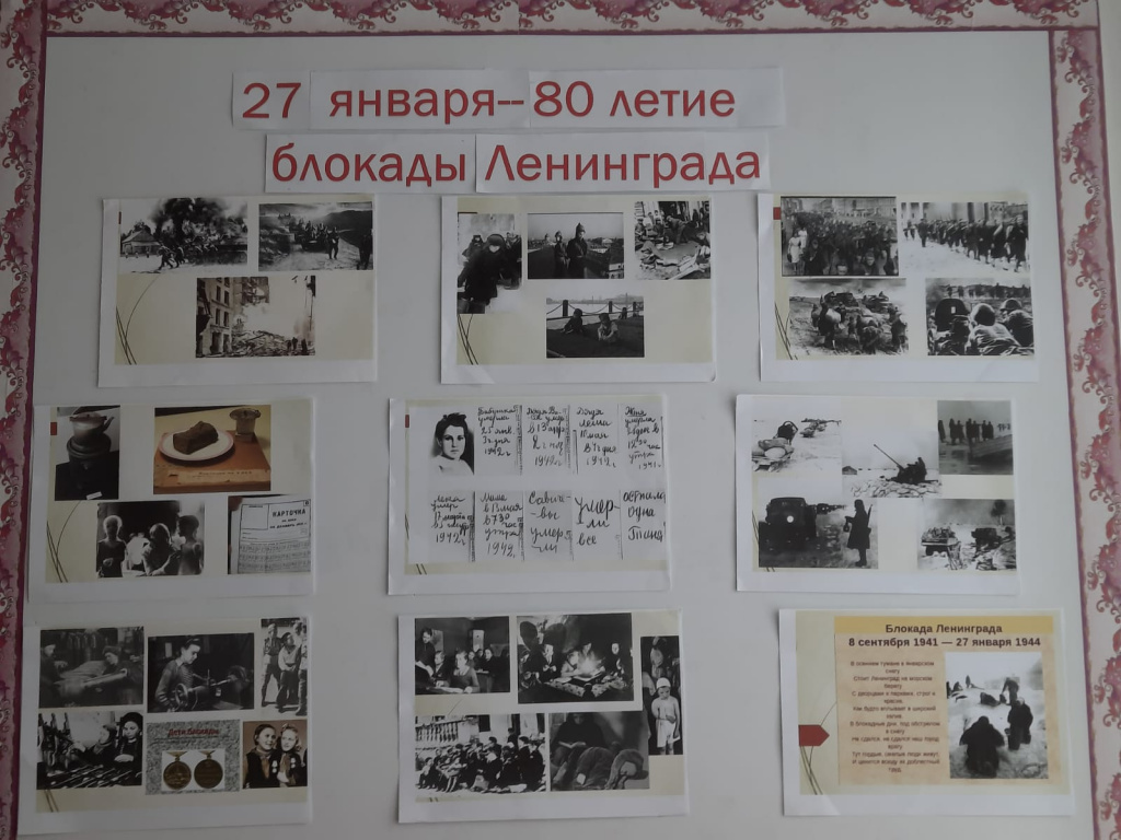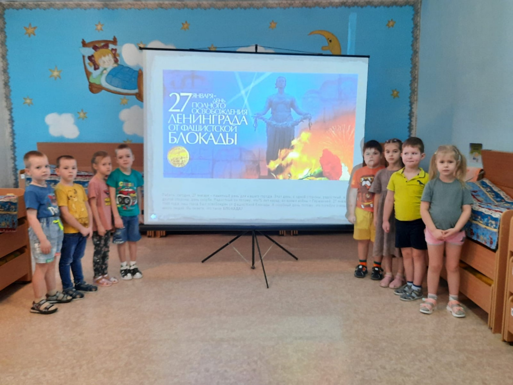 Памятные даты военной истории в настоящее время служат прекрасным примером для воспитания патриотизма у детей. Великая Отечественная война, несомненно, является самым ярким примером проявления героизма и патриотизма русских людей. Оборона Ленинграда — одна из самых славных и ярких страниц истории Великой Отечественной войны, один из самых выдающихся примеров стойкости и массового героизма советского народа в борьбе за независимость своей Родины. 27 января является Днём воинской славы России — День полного освобождения советскими войсками города Ленинграда от блокады его немецко-фашистскими войсками. Ребята узнали о «Дороге жизни» через Ладожское озеро и её роли в жизни блокадного Ленинграда, о «Карточках на хлеб» — как тяжело доставался кусок хлеба людям на фронте, в глубоком тылу, в блокадном Ленинграде. Хлеб ценился наравне с боевым оружием. Дети с замиранием слушали, как жители мужественно обороняли свой город: женщины рыли окопы, вчерашние школьники стали солдатами, дети работали на заводах и фабриках, встав за станки вместо ушедших на фронт братьев и отцов, услышали о многочисленных подвигах защитников Ленинграда, благодаря которым город выстоял и победил! Пока память об этих страшных днях живет в наших сердцах, находит отклик не только в стихах поэтов и полотнах художников, но и в детских душах, это не должно повториться!