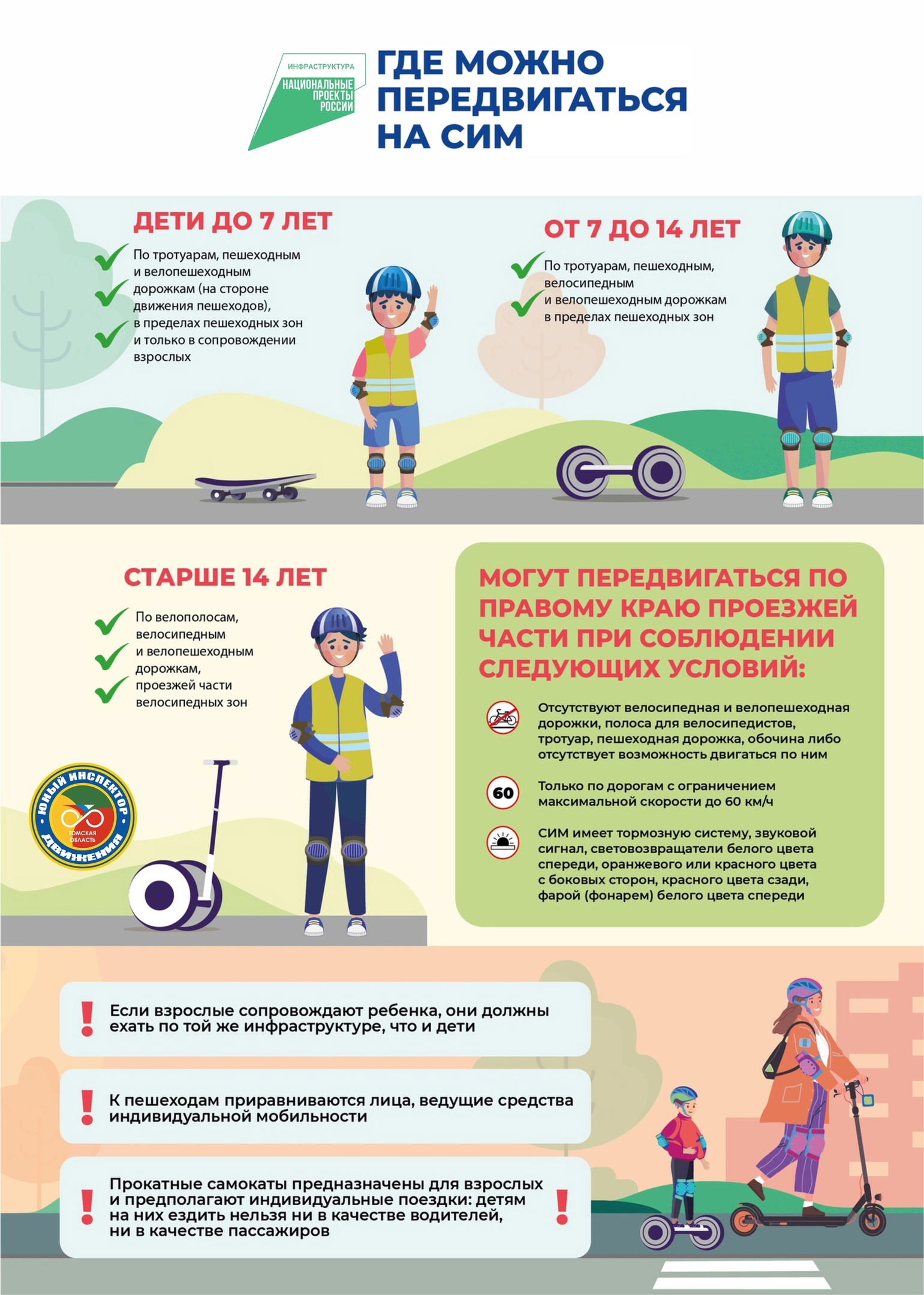 ⚠ На электросамокате можно передвигаться только одному. Движение на СИМ разрешено по велосипедным (велопешеходным) дорожкам. А по пешеходным дорожкам можно кататься только в случае, если там нет запрещающих знаков. Если тебе 14 лет и больше, можно кататься по дороге, но только по правой стороне и не быстрее 60 километров в час.