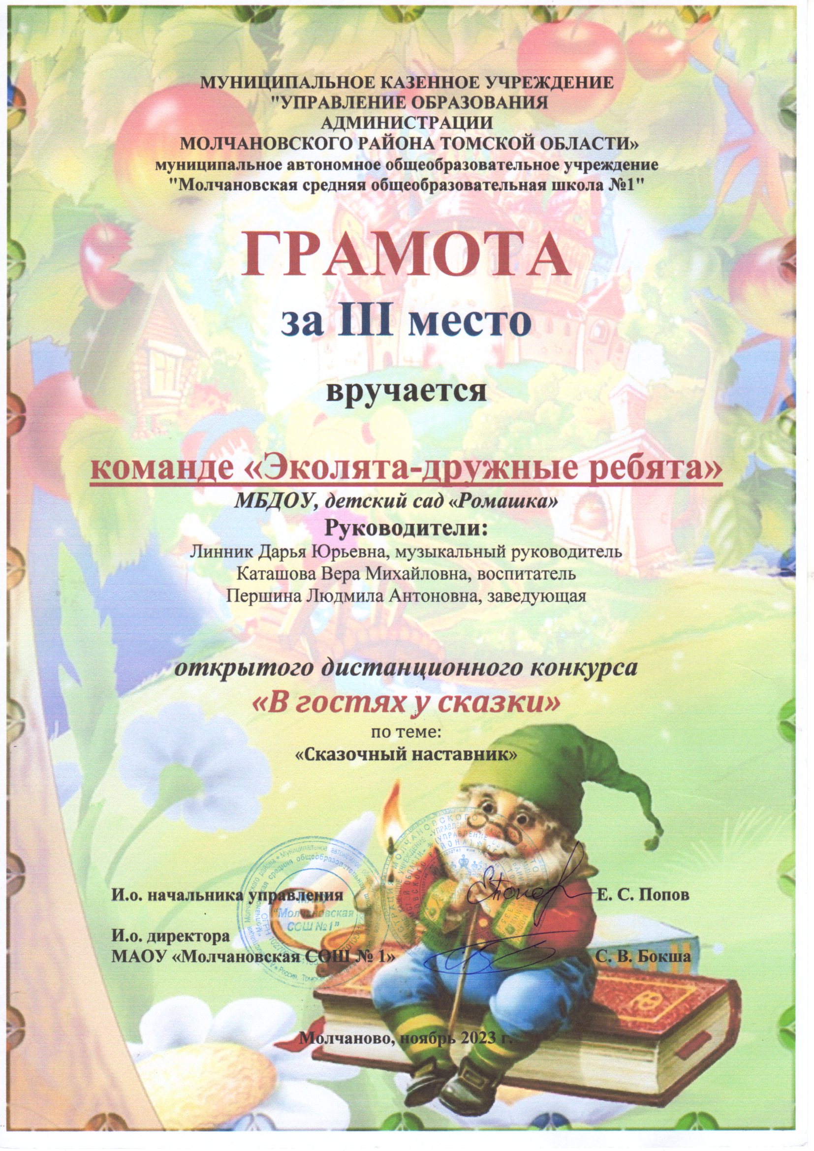 Команда «Эколята — дружные ребята» из детского сада «Ромашка» приняли участие в муниципальном конкурсе «В гостях у сказки» по теме «Сказочный наставник».