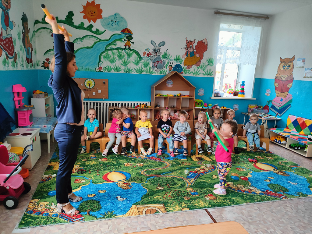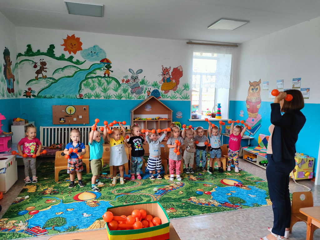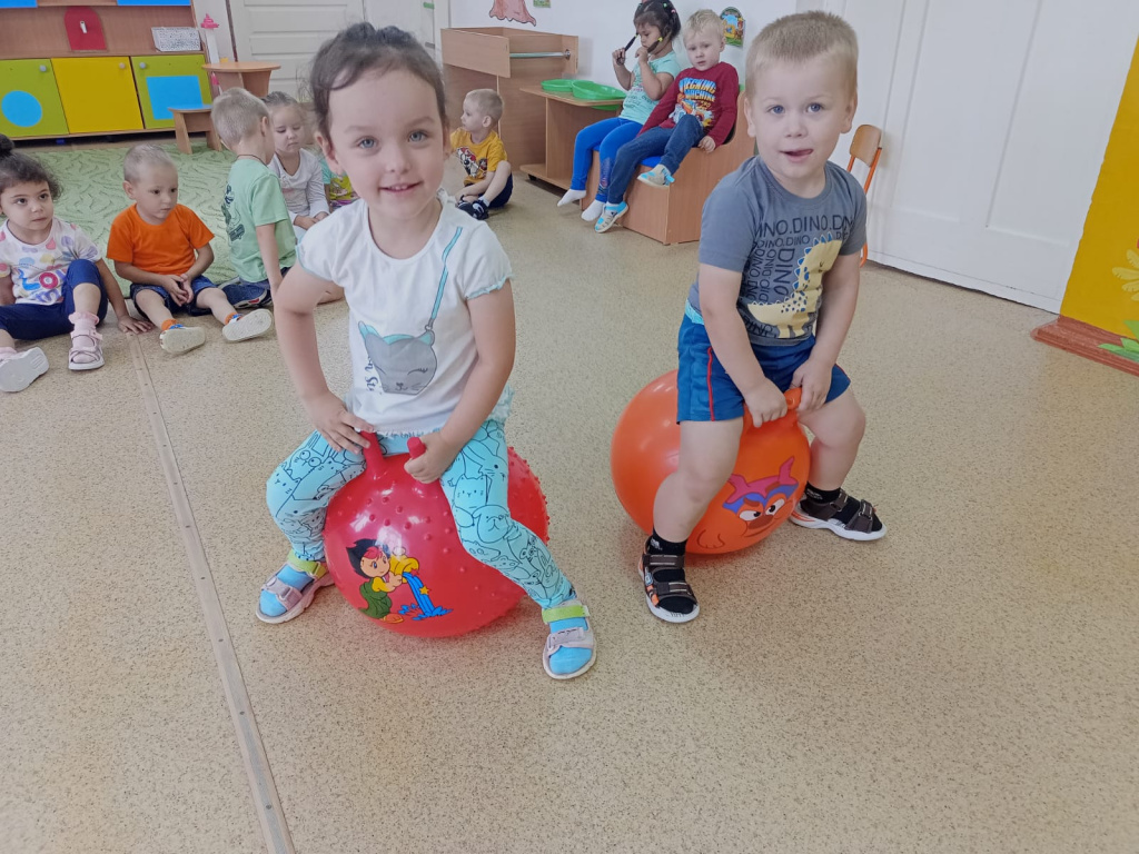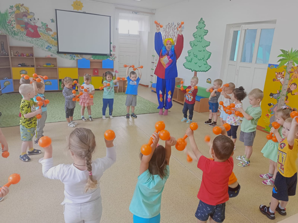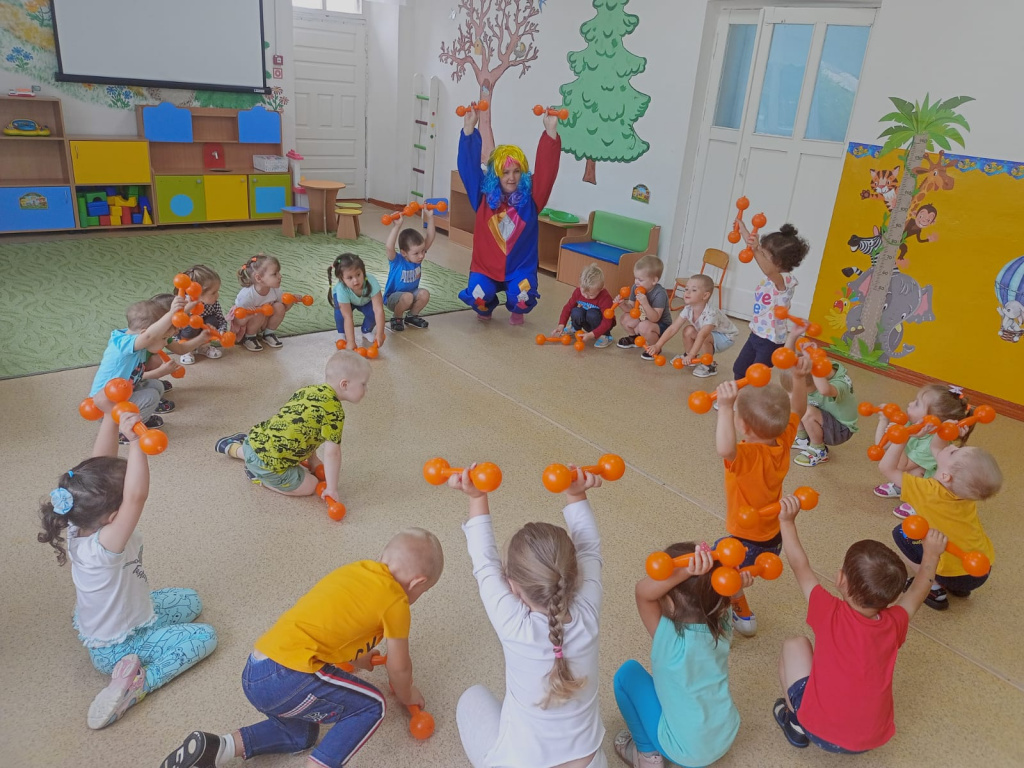 В младшей группе «Пчёлки» день начался с торжественного построения и дети, под руководством воспитателя Яковлевой Н.И. сделали разминку, которая прошла под зажигательную музыку «Делайте зарядку!». Чуть позже в гости к ребятам пришла клоунесса Жужжа, которая любит спорт и она рассказала ребятам о значении спорта в жизни человека, потом она пригласила ребят выполнить спортивные упражнения, поиграть в игры и попрыгать на мячах. С большим интересом прошли спортивные игры. День был насыщен двигательной активностью детей, смехом, радостью и весельем. Никто из участников игр не почувствовал себя слабым.