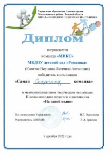 9 декабря команда педагогов, МБДОУ детский сад «Ромашка» в составе: Анисимовой Е.В., Ивановой К.В., Былиной О.А., Рындиной А.П., Линник Д.Ю., Литвиненко В.А., Якубович Т.М., участвовали во встрече межмуниципального творческого челенджа «Школы молодого педагога и наставника», которая проходила на базе МАОУ «Молчановская СОШ №2». Встреча проходила под девизом «Молодые и мудрые на одной волне!».