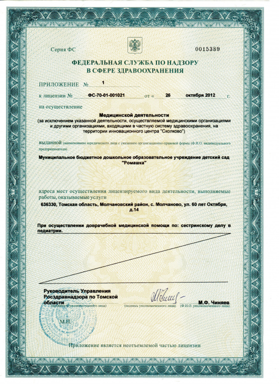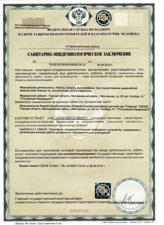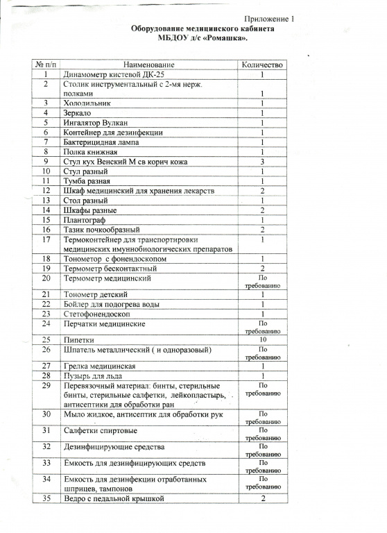 Медицинский блок представлен следующими помещениями: медицинский кабинет (осмотр детей, работа с документацией, рабочее место старшей медицинской сестры), прививочный кабинет, место хранения дезинфицирующих средств, (СИЗ и антисептики). Медблок оснащен медицинским оборудованием и инвентарем в необходимом объеме, медикаменты приобретены в соответствии с утвержденным перечнем. Сроки годности и условия хранения соблюдены. В каждой группе имеется аптечка первой неотложной помощи, которая регулярно обновляется.