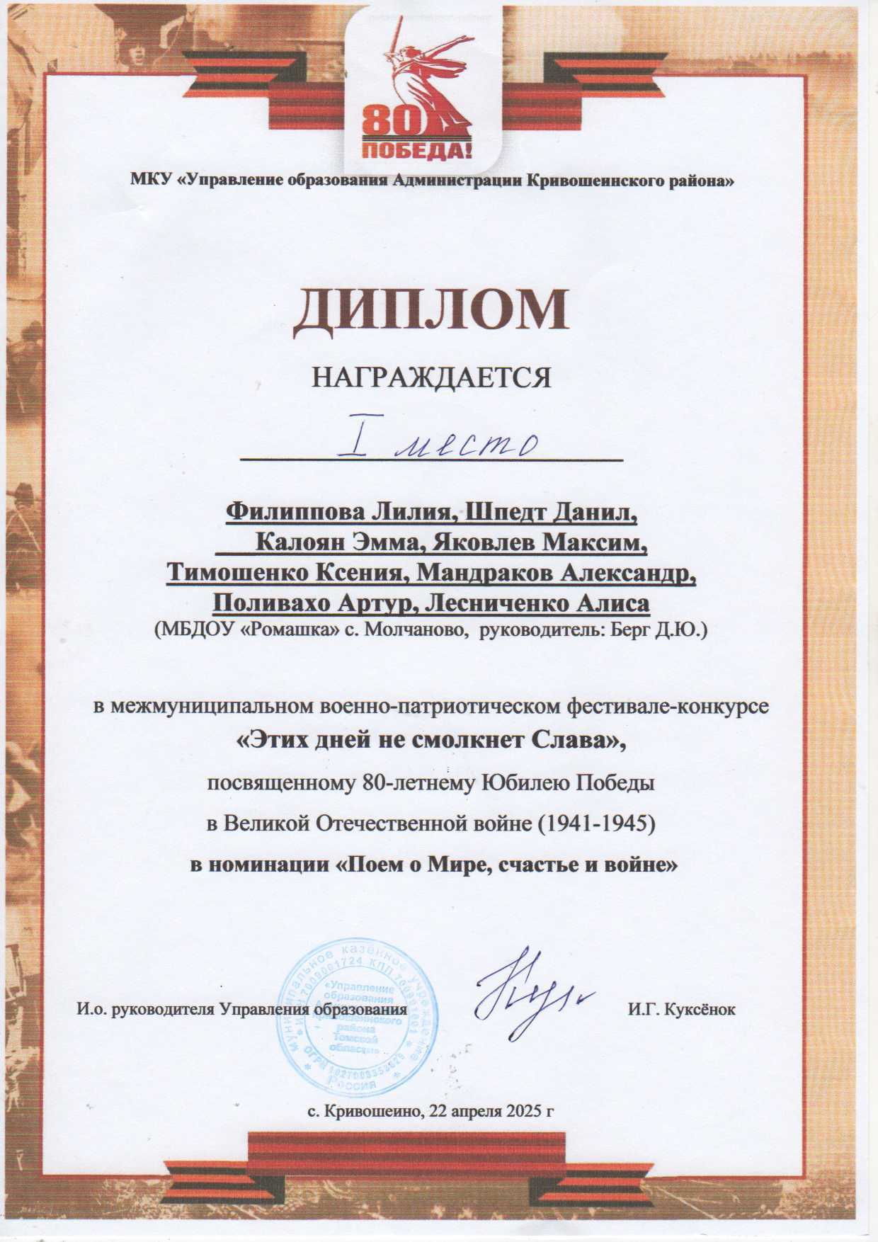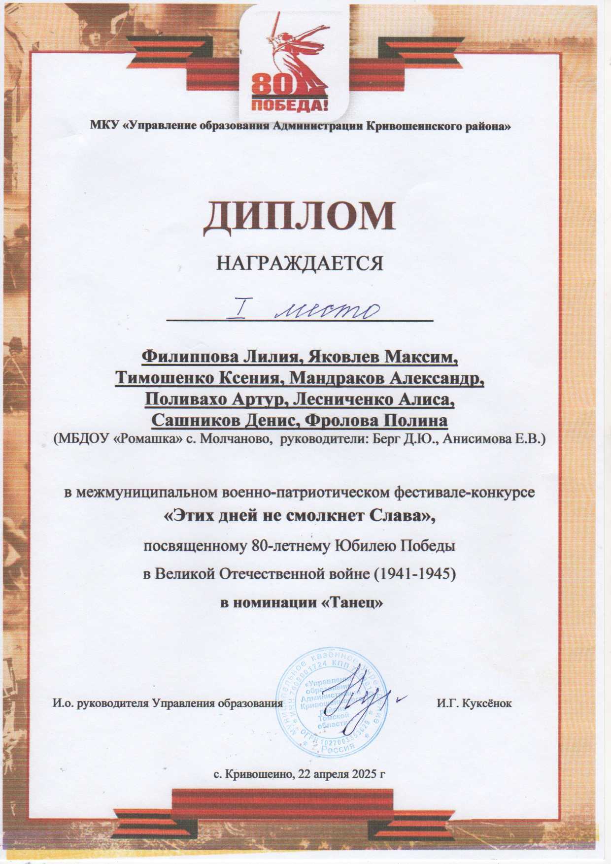 22 апреля 2025 года МКУ «Управление образования Администрации Кривошеинского района» стало площадкой для проведения межмуниципального военно-патриотического фестиваля-конкурса «ЭТИХ ДНЕЙ НЕ СМОЛКНЕТ СЛАВА», посвященного 80-летию Великой Победы. Мероприятие объединило юные таланты, стремящиеся почтить память героев и выразить свою любовь к Родине через творчество.