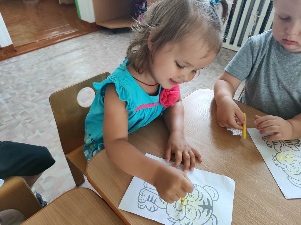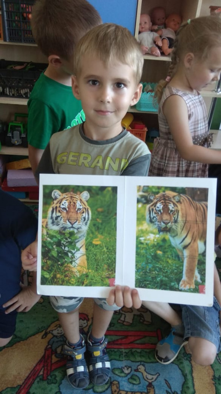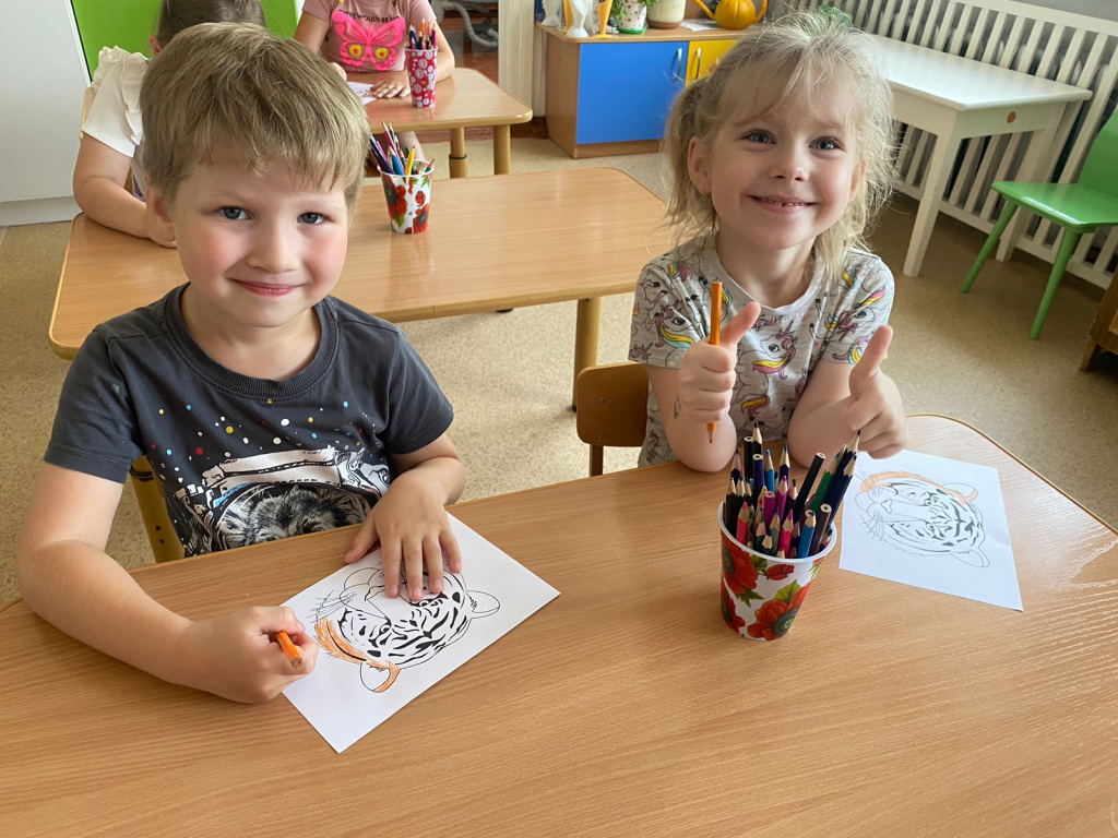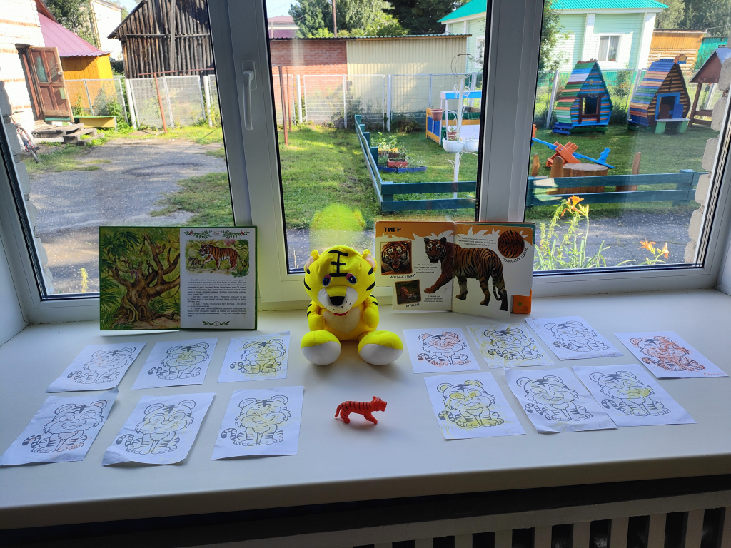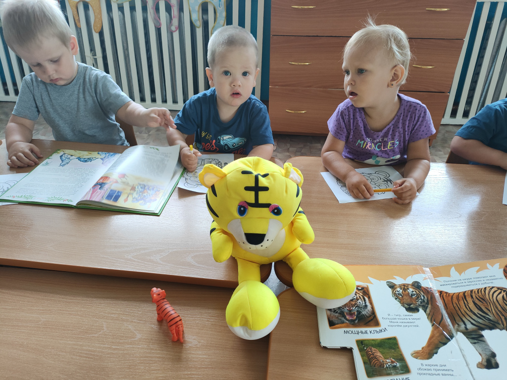 В группе «Жемчужинки» мы с ребятами поговорили о жизни тигров, о том, где они могут жить, чем питаются, какая связь между тиграми и нашими милыми домашними кошечками. Рассмотрели картинки с изображением тигров и тигрят, почитали энциклопедию для детей, послушали рычание тигра, поиграли в подвижную игру на прогулке «Быстрый тигр» и постарались раскрасить тигров с помощью восковых карандашей.