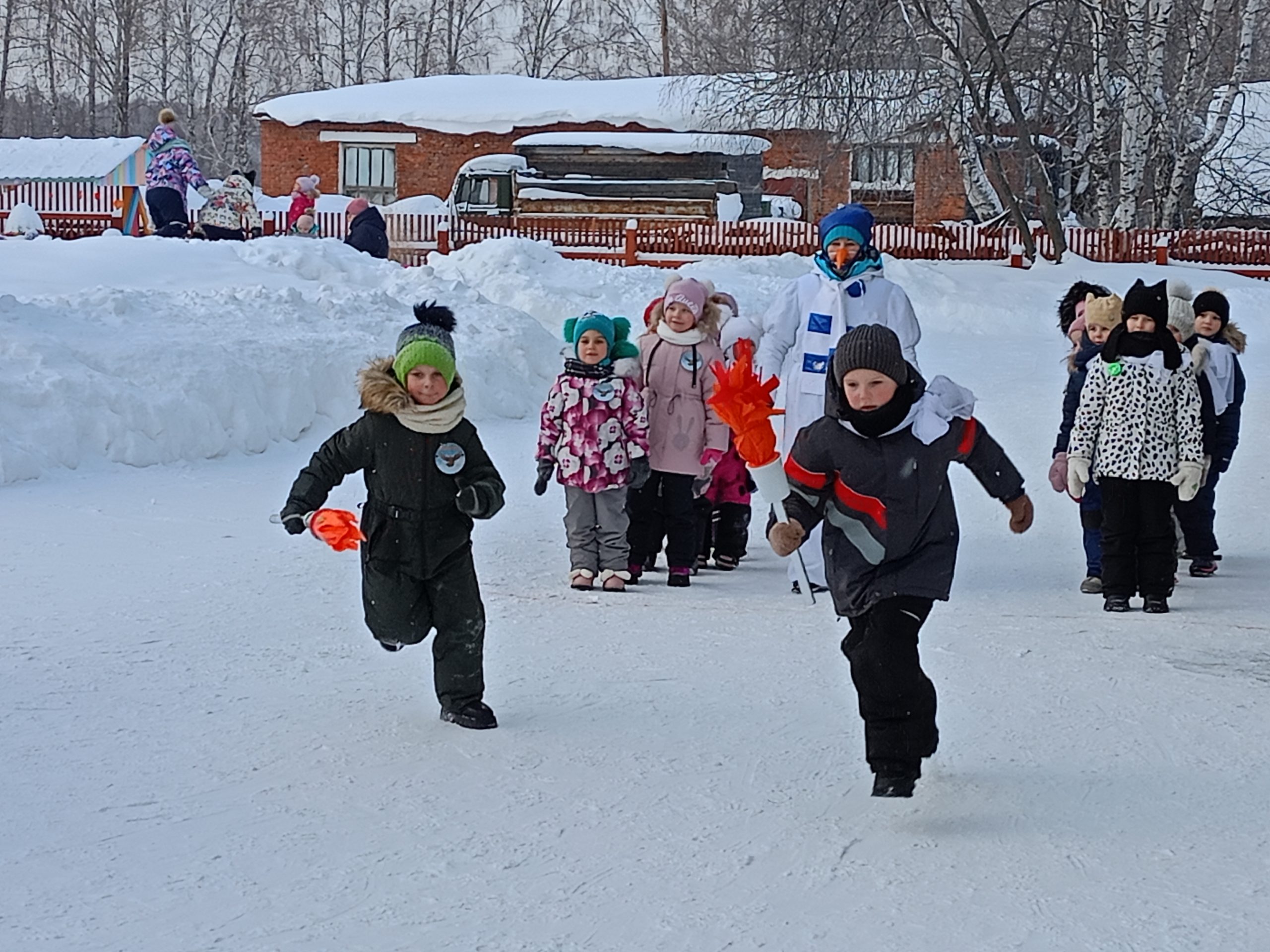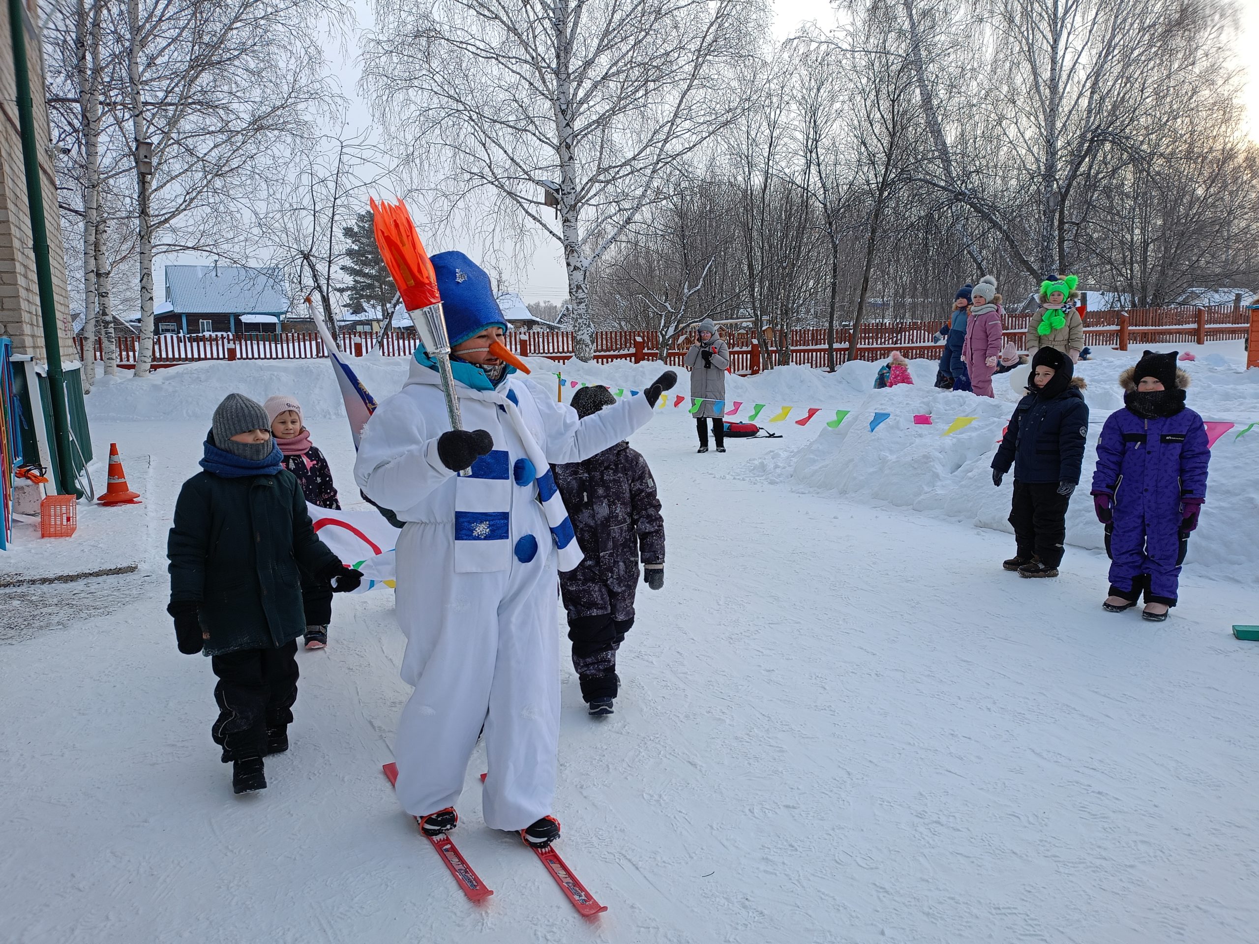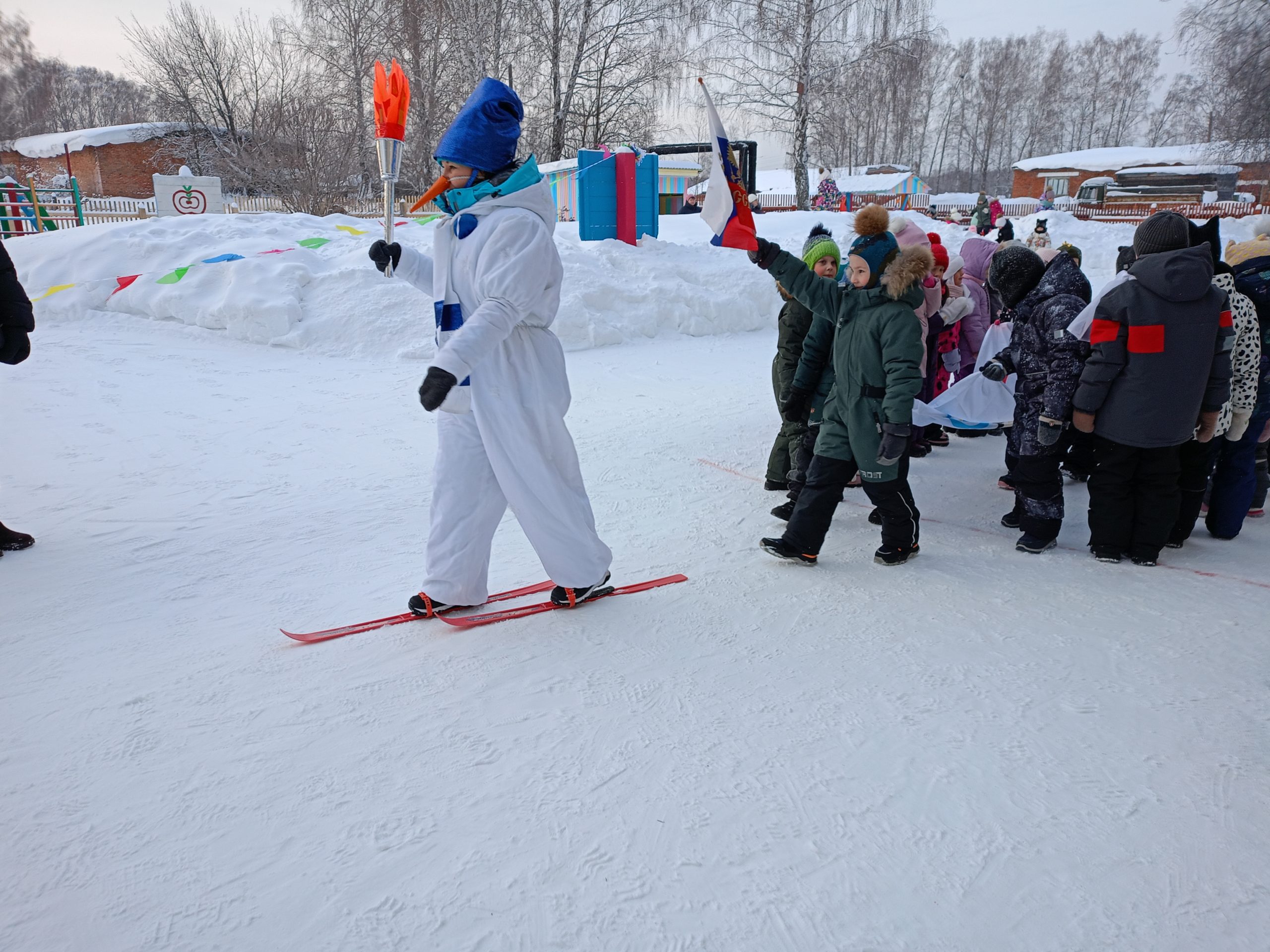 Отличная погода с легким морозцем создавала прекрасное спортивное настроение, стремление к победе и давала море положительных эмоций! Все участники «Малых зимних Олимпийских игр» выступали как настоящие спортсмены-чемпионы. В соревнованиях приняли участие две команды: «Белые медведи» и «Сокол». Ребята показали свою силу, быстроту и ловкость. Открытие Олимпиады началось с внесением Олимпийского флага и Олимпийского огня, которые с гордостью несли ребята подготовительной группы детского сада «Малыш» и Веселый снеговик. Ведь огонь — это символ дружбы и мира.