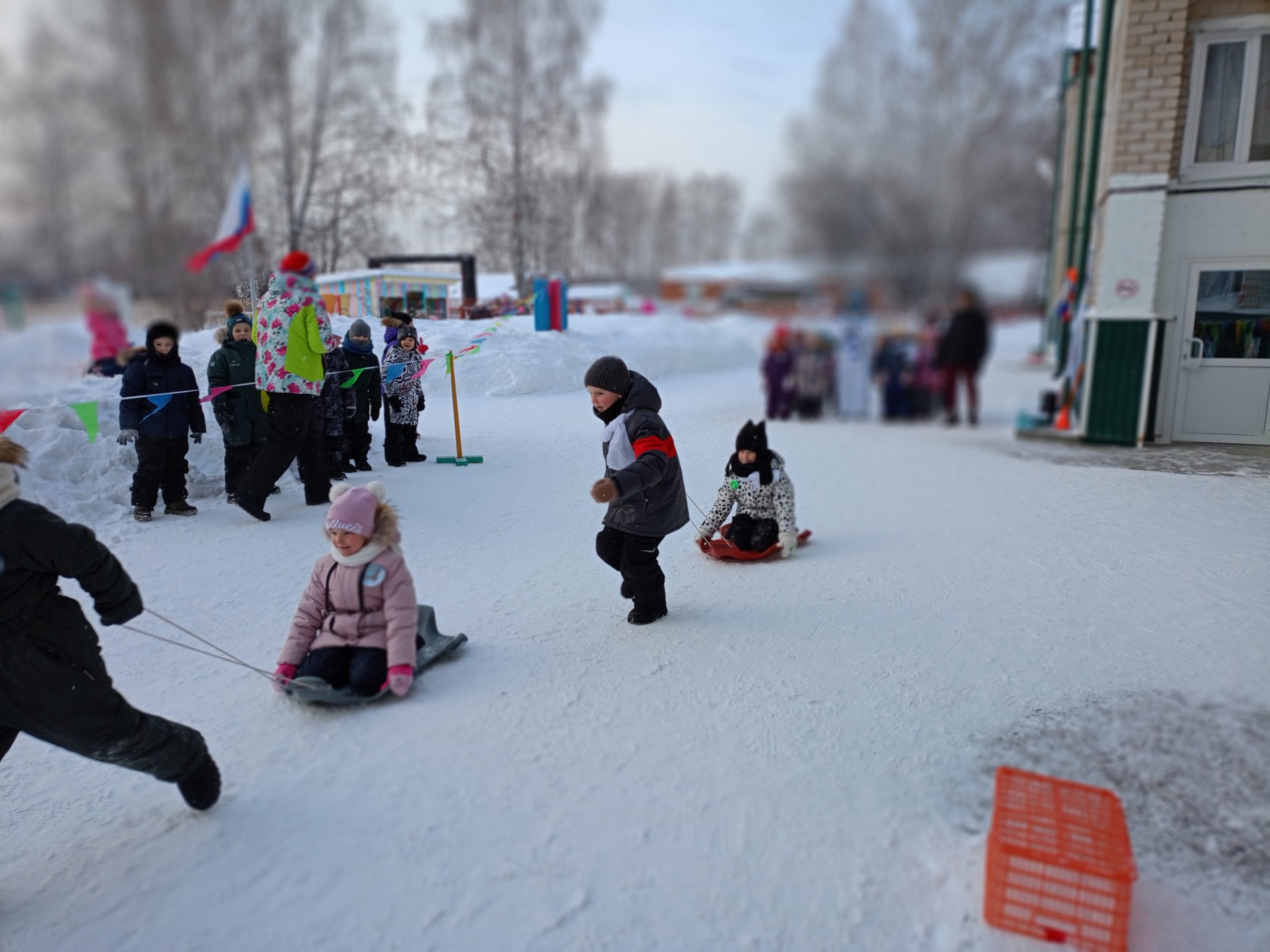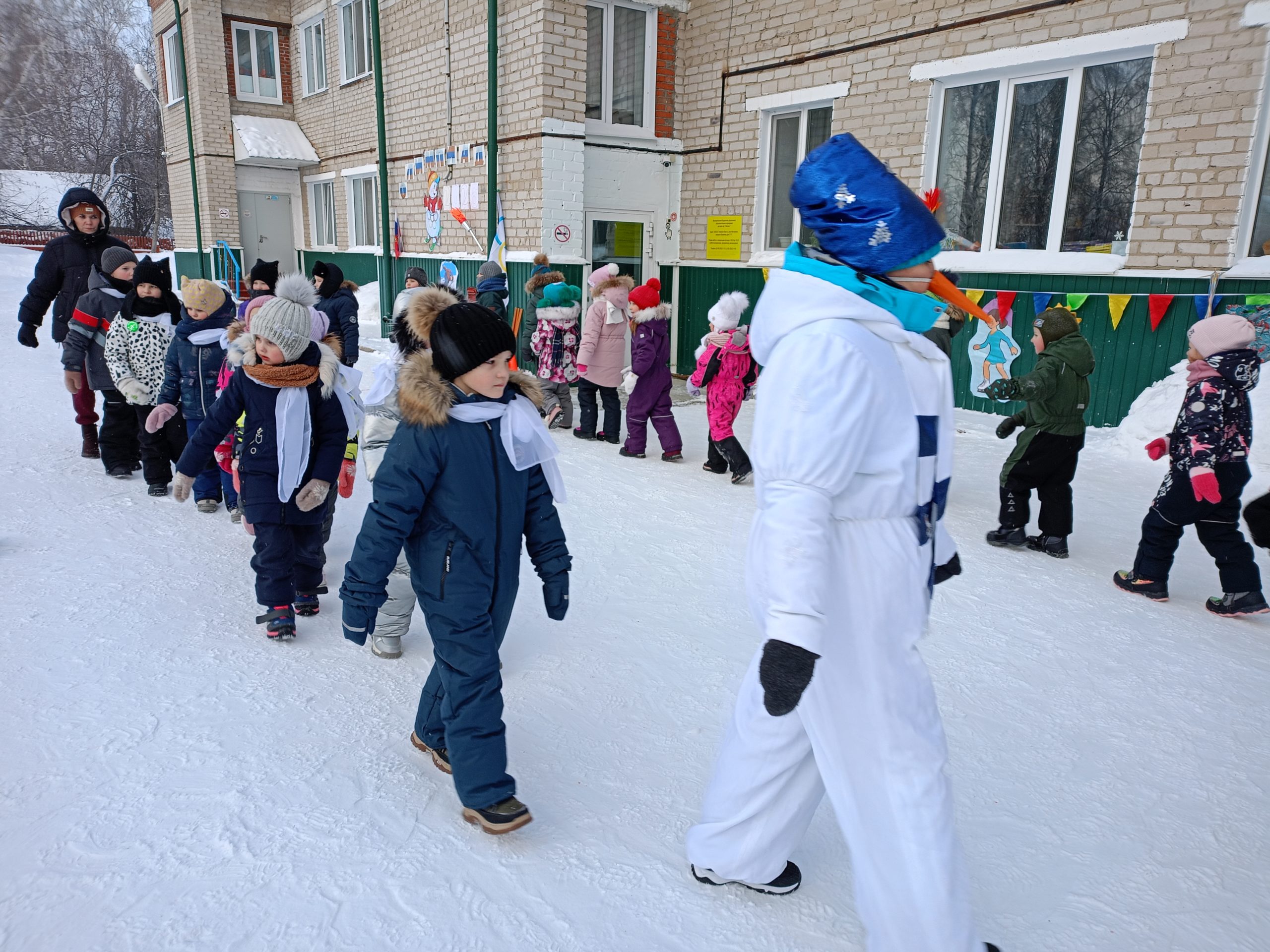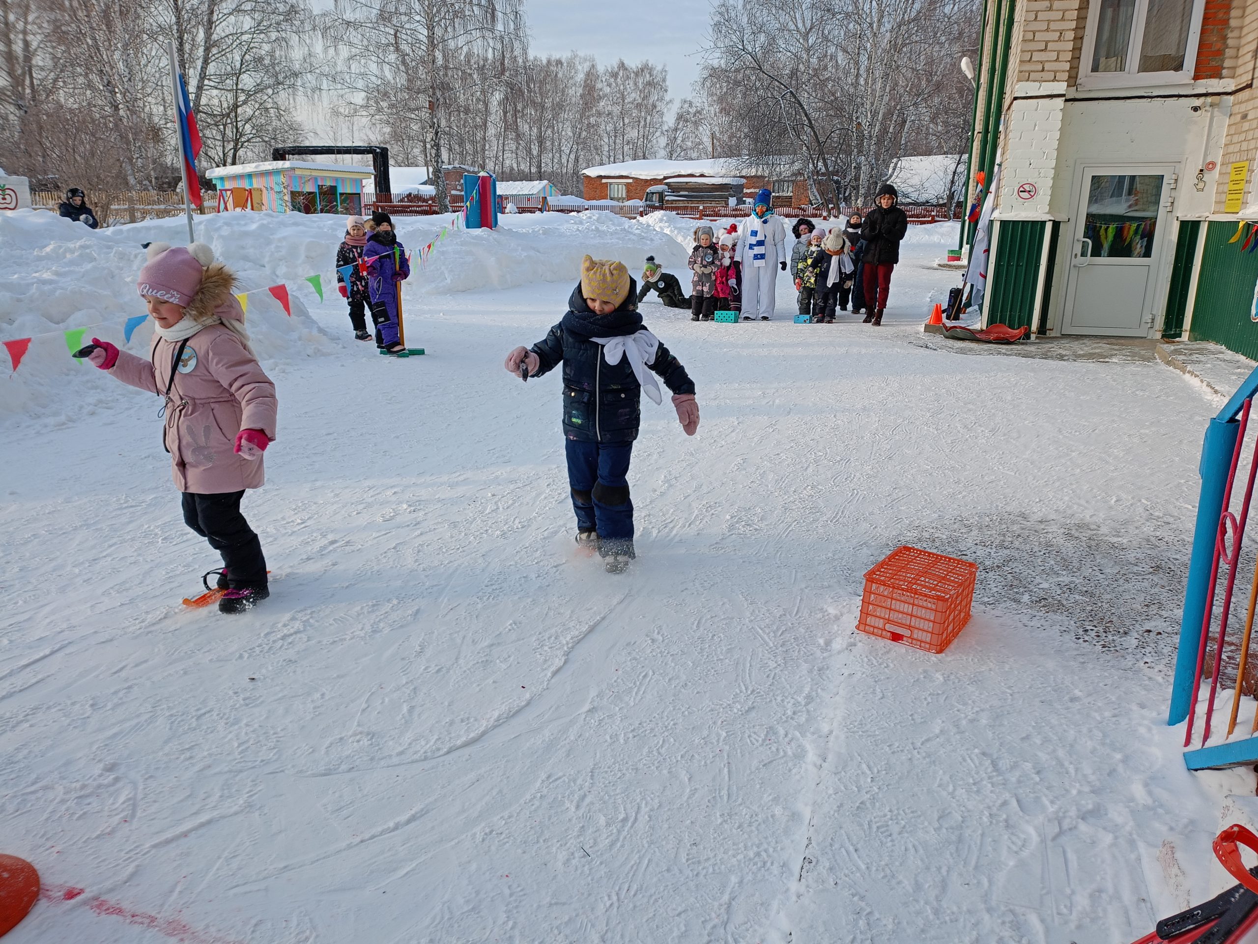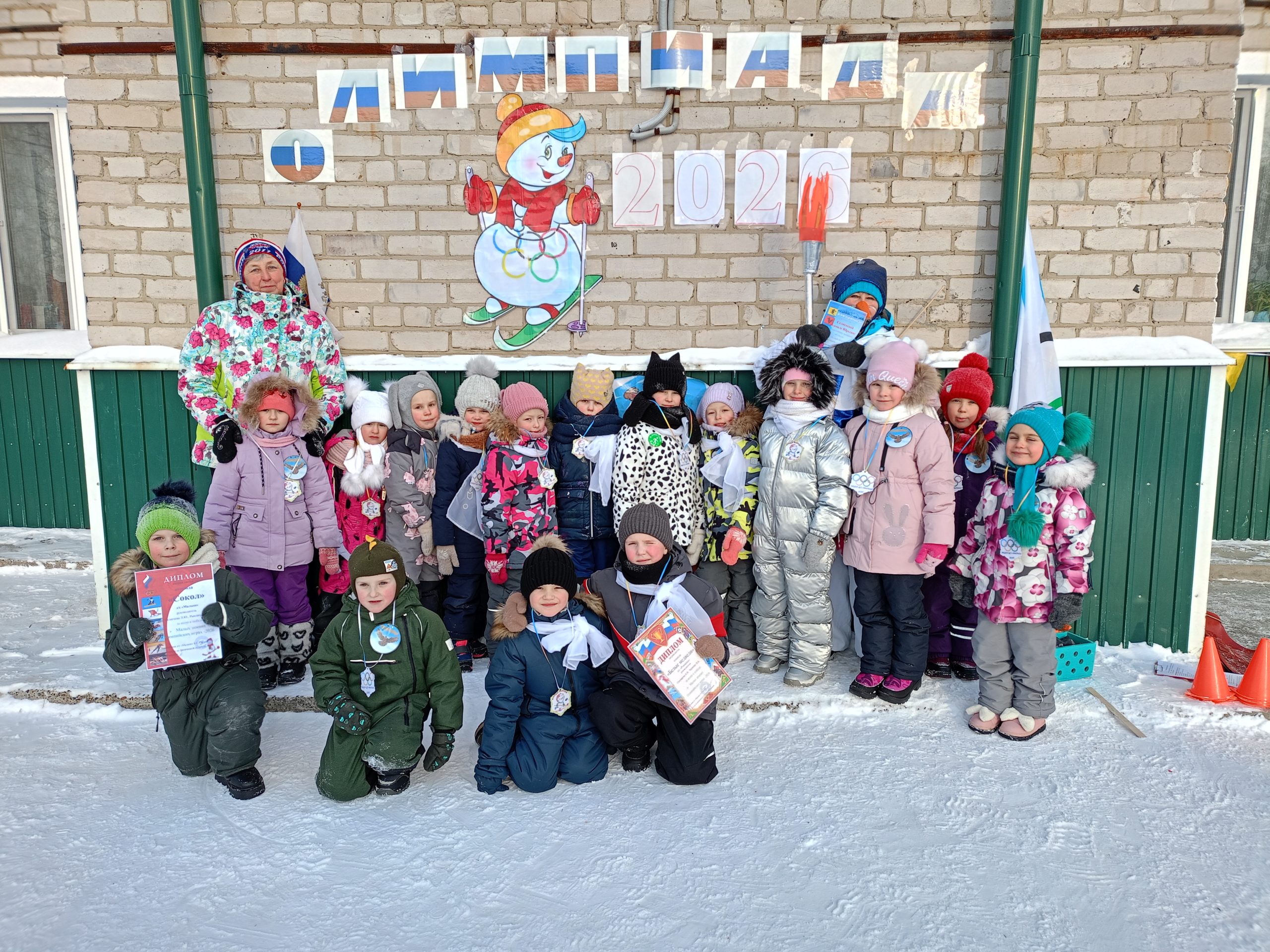 Отличная погода с легким морозцем создавала прекрасное спортивное настроение, стремление к победе и давала море положительных эмоций! Все участники «Малых зимних Олимпийских игр» выступали как настоящие спортсмены-чемпионы. В соревнованиях приняли участие две команды: «Белые медведи» и «Сокол». Ребята показали свою силу, быстроту и ловкость. Открытие Олимпиады началось с внесением Олимпийского флага и Олимпийского огня, которые с гордостью несли ребята подготовительной группы детского сада «Малыш» и Веселый снеговик. Ведь огонь — это символ дружбы и мира.