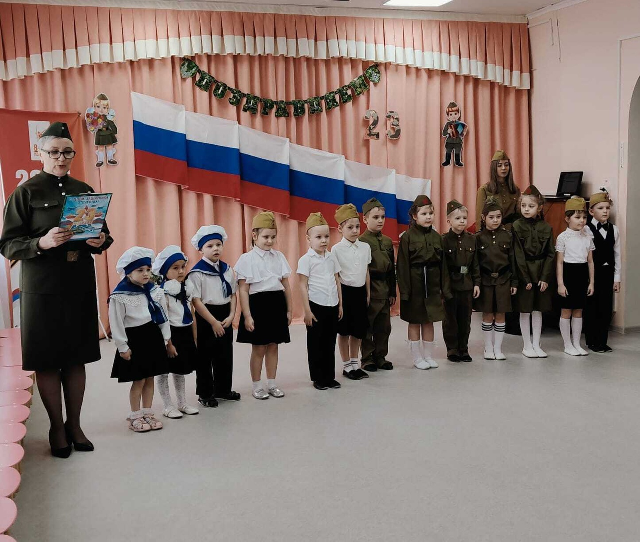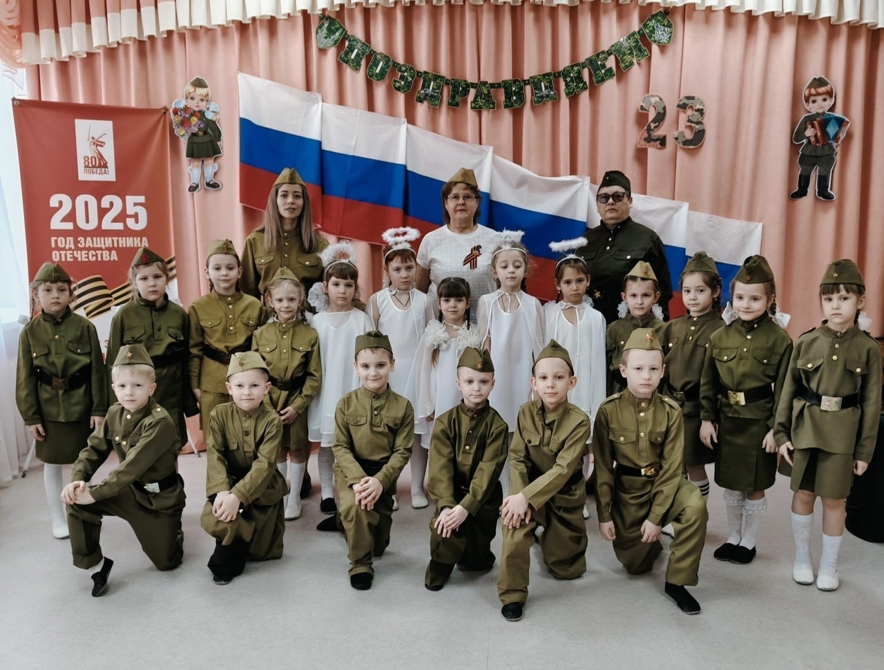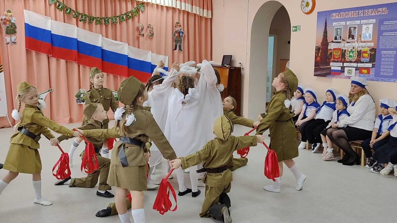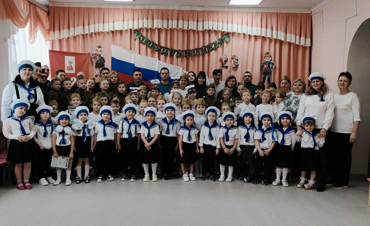 Под звуки марша и аплодисменты болельщиков и гостей нашего праздника отряды участников смотра-конкурса строевым торжественным маршем зашли в зал на парад. Командиры отрядов Нерлова Айталина (средняя группа), Литвиненко Евгений (старшая группа), Шпедт Данил (подготовительная группа) доложили о готовности отрядов к смотру строя и песни командующему парадом старшему воспитателю Анисимовой Е.В. Как и положено, торжественное построение началось с равнения на флаг Российской Федерации и исполнения участниками Гимна России. «Во все времена наша Российская Армия славилась своими воинами. У неё славное прошлое и, надеемся, достойное будущее. А будущее нашей Российской Армии – это вы, ребята, сегодняшние мальчишки и девчонки. Мы надеемся, что сегодня каждый участник постарается проявить свои только самые положительные качества – ответственность, собранность, умение слаженно работать в команде, а еще и любовь к Родине, готовность встать на её защиту в случае необходимости», — такими словами приветствовала участников смотра-конкурса заведующая детским садом Л.А. Першина. Всех присутствующих в зале мужчин, и по совместительству членов жюри, ребята поздравили с наступающим Днём защитника Отечества и приветствовали троекратным «Ура!». В конкурсной части смотра каждый отряд прошелся строевым шагом колонной по одному за направляющим (Берг Д.Ю.) по периметру зала. Ребята выполнили повороты налево, направо, кругом, исполнили строевую песню и порадовали зрителей своими танцами. Самые младшие, воспитанники средней группы «Пчёлки», представляли военно-морской флот и вышли на парад в образе моряков. Слова исполненной ими песни «Моряки ничего не боятся!» только подбадривали их. А затем наши маленькие морячки с удовольствием исполнили фирменный танец всех российских моряков «Яблочко». В награду получили заслуженные аплодисменты зрителей. Следующие участники парада представляли сухопутные войска. Пехотинцы средней группы «Ягодки» стройным шагом промаршировали по залу, слажено выполнили строевые команды, дружно исполнили песню «Солдатики» и завершили свое выступление танцем «Наша армия». Историческую часть конкурса выпала честь представить воспитанникам подготовительной к школе группе «Ромашки». В год 80-летия Победы в Великой Отечественной войне ребята вышли на парад в военной форме солдат того времени. Четко чеканя шаг под песню «Раз, два, левой!» дети выполнили строевые команды. В завершении своего выступления, в память о всех погибших защитниках Отечества ребята исполнили проникновенный танец под песню Shamanа (российского певца, композитора, автора песни Ярослава Дронова) «Встанем!». Со слезами на глазах зрители и члены жюри смотрели на ребят, исполнявших роли погибших солдат, ушедших на небеса, всех тех, «кого в этом огне потеряли, кто шёл умирать за свободу, а не за медали»… Слова песни: «Встанем… Мы скажем спасибо за то, что Победу нам дали, За тех, кто нашёл своё небо, и больше не с нами! Встанем и ближе к ним станем, Герои России останутся в наших сердцах До конца!» и танец детей просто раздирали душу зрителей. В зале не было ни одного равнодушного. Очень трудно пришлось членам жюри, в состав которого вошли родители наших воспитанников и сотрудники детского сада, в большей части – мужчины, наши защитники Отечества, им предстояло 