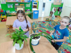 В рамках тематической недели «Комнатные растения» ребята подготовительной группы «Улыбка» узнали о многообразии комнатных растений; узнавали и правильно называли их. Закрепили знания об основных потребностях комнатных растений с учетом их особенностей; совершенствовали навыки по уходу за ними. С особым старанием ухаживали за комнатными растениями: рыхлили почву, поливали, опрыскивали их. Цветы будут долго радовать нас своей красотой при правильном уходе. Ребята рассматривали растения, находили сходство и отличие; называли основные части: корень, стебель, лист, цветок, плод с семенами. Рисовали понравившейся комнатное растения с натуры.