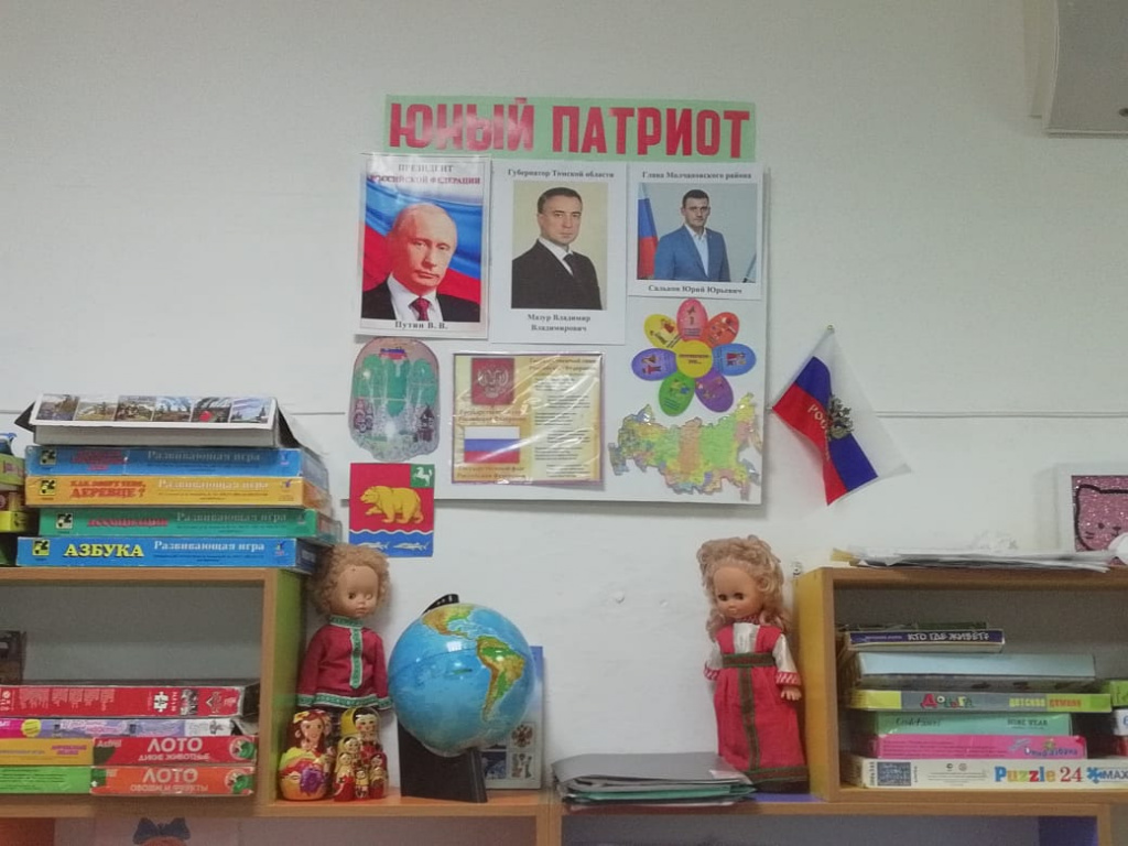 Воспитатели проявили творческий подход к оформлению, пополнили уголки тематическими альбомами, государственными символами России, Томской области и Молчановского района, материалами с видами достопримечательностей с. Молчаново, г. Томска и страны, детской художественной литературой, консультациями для родителей на заданную тематику. Здесь можно увидеть и кукол в национальных костюмах, и  русскую красавицу Матрёшку. Педагоги смогли создать такую предметно – развивающую среду, которая интересно и доступно формирует интерес к «малой Родине», расширяет представления детей о родной стране, государственных и народных праздниках, народных традициях, труде взрослых, способствует развитию совместной деятельности.
