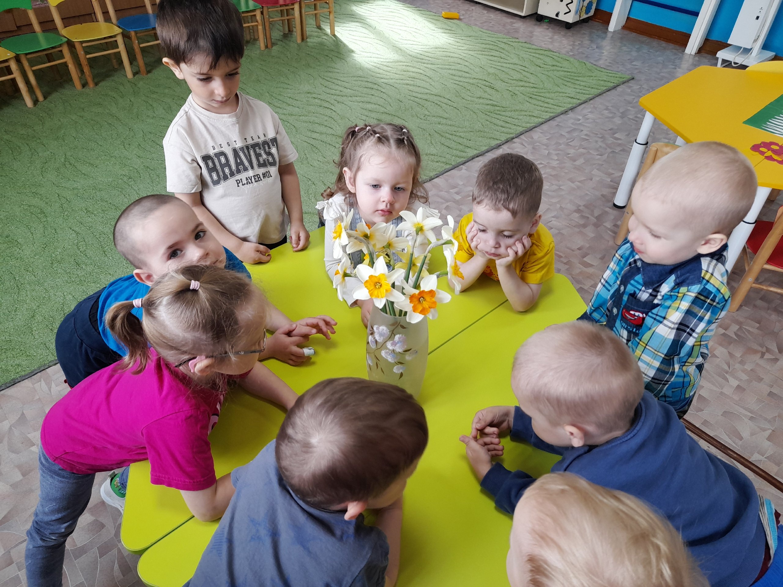 В гости к ребятам прискакал зайчик с букетом нарциссов. Дети с интересом рассмотрели живые цветы, почувствовали их аромат и осторожно потрогали нежные лепестки. Вместе с зайчиком они провели физкультминутку «Цветочки на лугу».